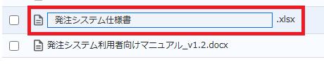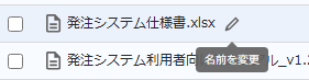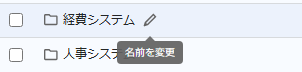 実務者向け文書管理フォルダ/ファイルの名前を変更したいこのページの見出し文書の名前を変更したい 概要 本章ではフォルダ/ファイルの名前を変更する方法をご案内します。 以下手順で文書一覧画面へアクセスし、フォルダ/ファイルの名前を変更してください。 文書一覧画面にアクセスする ナビゲーションバー > 文書 をクリックします。 フォルダ行をクリックし、対象のフォルダへ移動します。 名前を変更する 名前を変更したいフォルダ/ファイル名をホバーし、ペンアイコンをクリックします。 フォルダの場合 ファイルの場合 変更後の名前を指定し、Enterを押します。