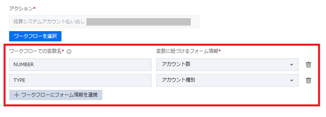 備考「ワークフローでの変数名」で設定した変数をワークフロー上で利用することで「変数に紐づけるフォーム情報」の情報を読み込めます。
