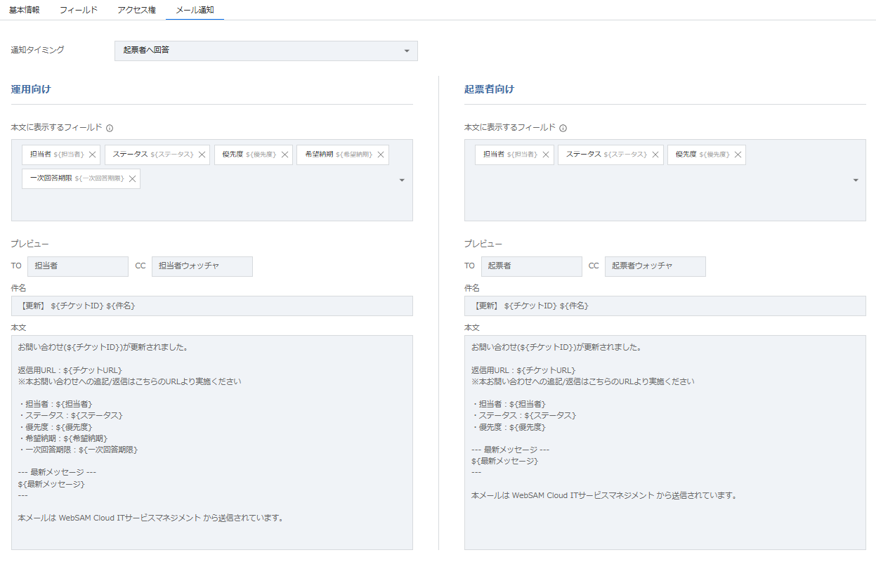 - 起票者、運用者それぞれに対する通知内容を設定します。