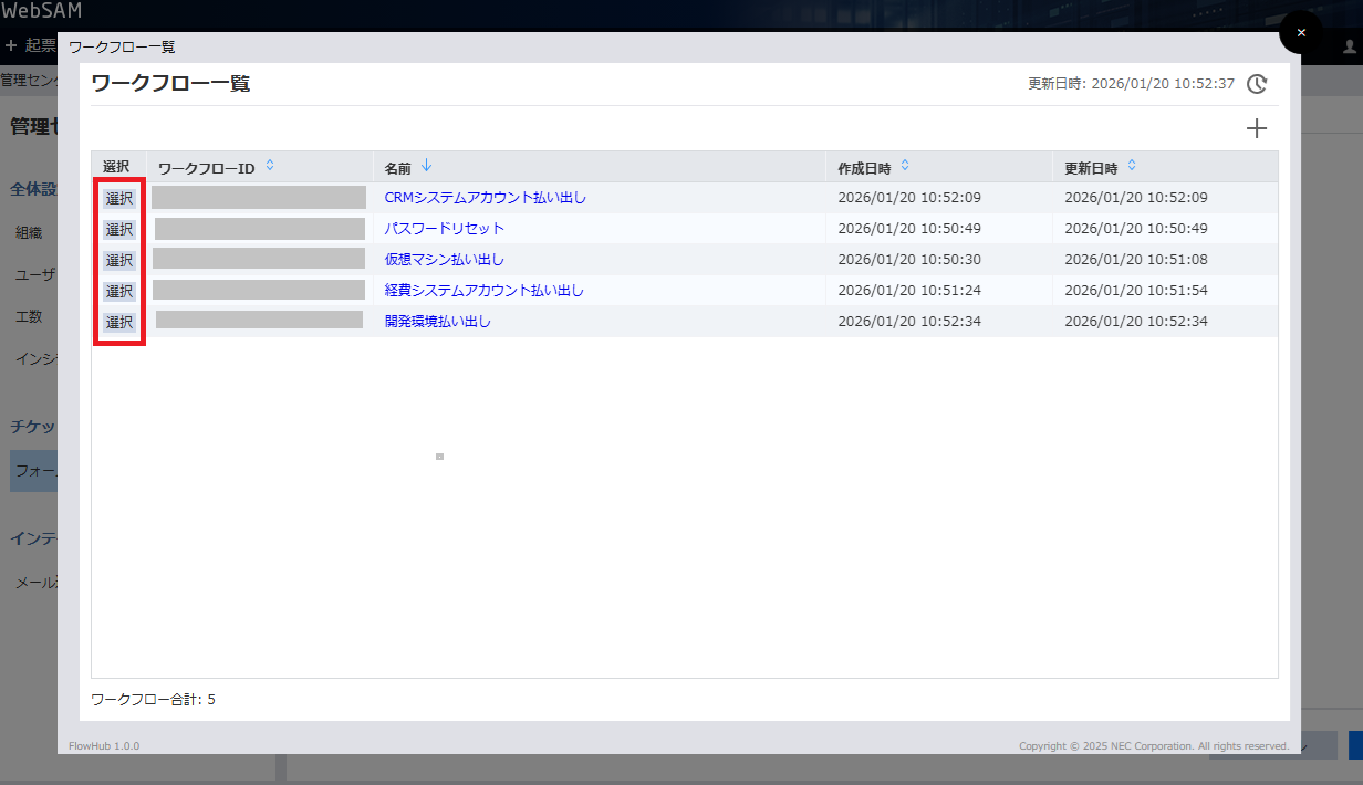 「ワークフロー一覧」から実行対象のワークフローの「選択」を押し、自動化設定画面の「アクション」に反映します。