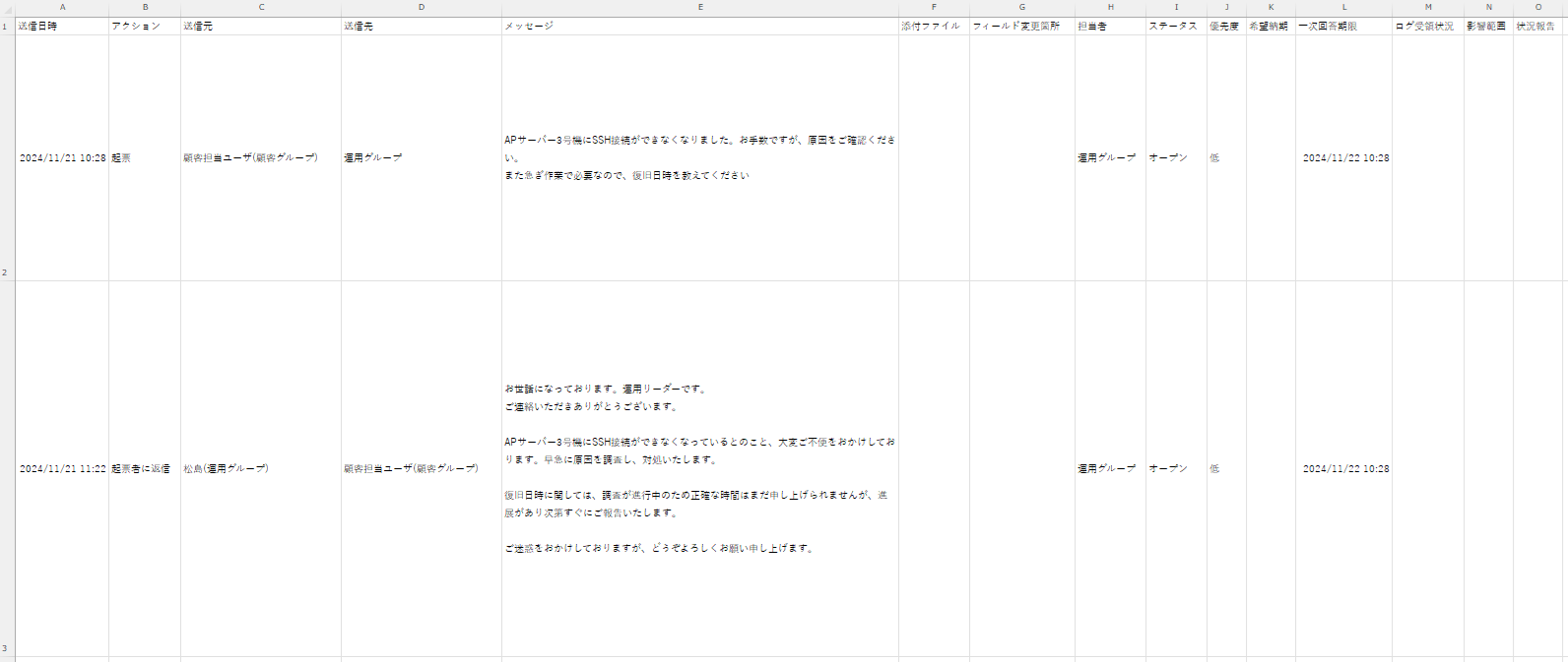- 送信日時、アクション、送信元、送信先、メッセージ、添付ファイル名、フィールド変更箇所、担当者、ステータス、優先度、希望納期、一次回答期限、カスタムフィールドがエクスポートされます