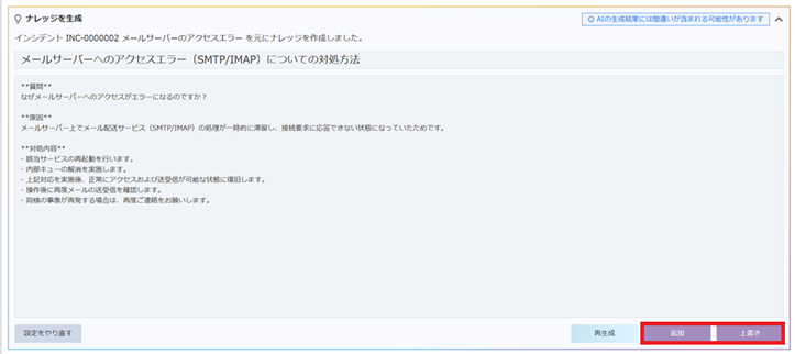 指定したインシデントの内容をもとに、ナレッジのとタイトルと本文の案が自動的に生成されます。