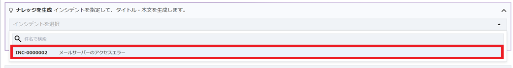 展開後、ナレッジの元となるインシデントを指定し、「ナレッジを生成」をクリッ クします。