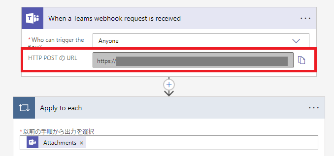 手順viで追加した「Teams Webhook 要求を受信したとき」オプションを参照すると「HTTP POSTのURL」にURLが表示されているため、こちらのURLをメモください