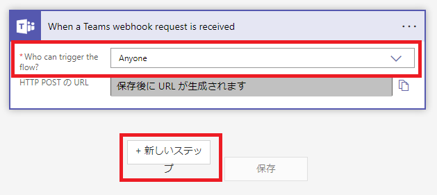 「Who can trigger the flow?」で 「Anyone」を選択し、「+新しいステップ」をクリックします