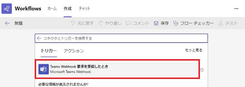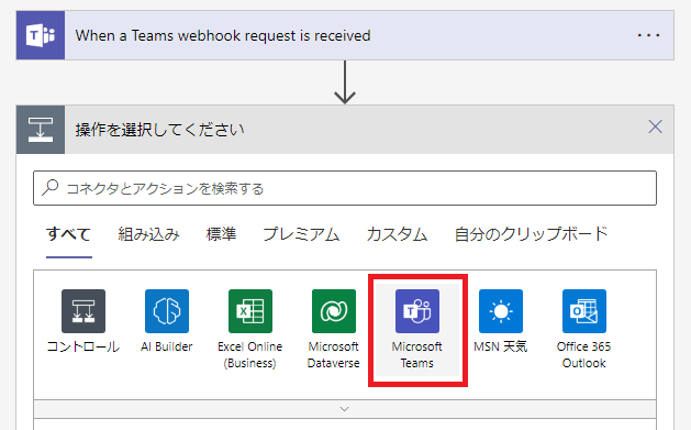 「Teams Webhook 要求を受信したとき」をクリックします